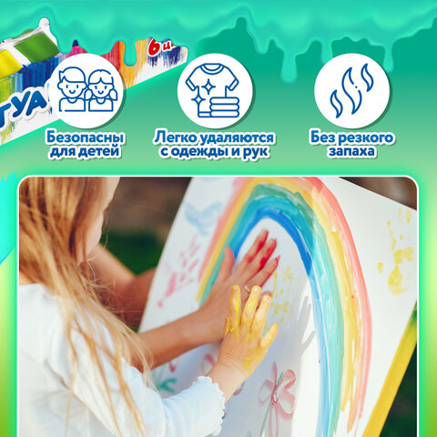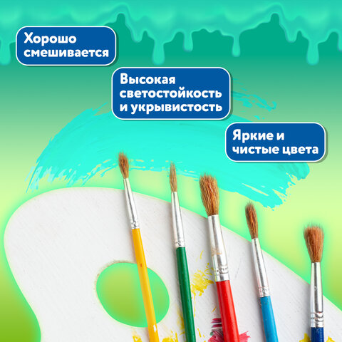 Краски полностью безопасны в использовании, не токсичны и не имеют резкого запаха. Гуашь обладает высокой светостойкостью и укрывистостью, легко размывается водой, хорошо наносится, без труда удаляется с рук и одежды. Краски находятся в пластмассовых герметичных баночках, которые скреплены в блок-тару. Объем каждой баночки равен 25 мл. Общий объем блок-тары - 150 мл.