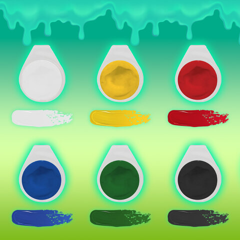 В наборе 6 ярких и насыщенных цветов: белый, красный, синий, черный, желтый, зеленый.