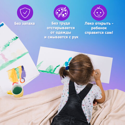 Гуашь подходит для детского творчества. Хорошо ложится на бумагу, картон, дерево, стекло, керамику. Имеет высокую светостойкость и укрывистость, приятную матовую поверхность. Натуральные нетоксичные компоненты. Удобные, плотно закрывающиеся баночки.