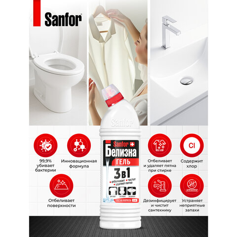 SANFOR "Белизна" гель 3 в 1 - специальное густое средство с инновационной формулой отбеливания и удаления пятен. Благодаря комплексному действию «3 в 1» - незаменимо при стирке, а также для дезинфекции и чистки сантехники и труб.