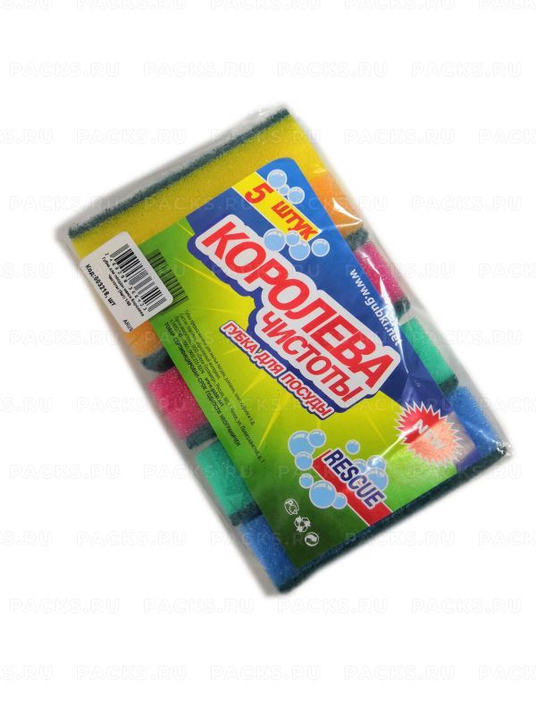 Губка для мытья посуды, состоящая из цветного ппу и абразивного слоя. Размер- 90х65х30. 5 губок в 1 единице, упакованы в БОПП с логотипом или этикеткой.